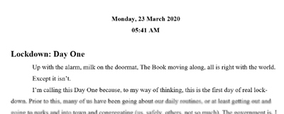For me, this wasn’t a big change. I have been keeping a journal since the age of eleven and the only difference between the Journal and the Lockdown Diary was that I proposed to update the Journal every day and number the entries accordingly. Therefore, I am, as of today, up to Lockdown Day plus 117(reminiscent of the WWII designations of D-Day plus ##).