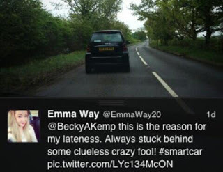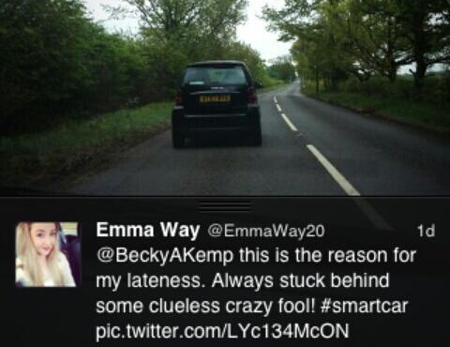 Emma Way: Tweeter and Safe Driving Poster GirlHere’s what happened:Twenty-one year old Emma Way, who lives in the Norwich area, was driving sedately and safely to work, as is her usual habit: