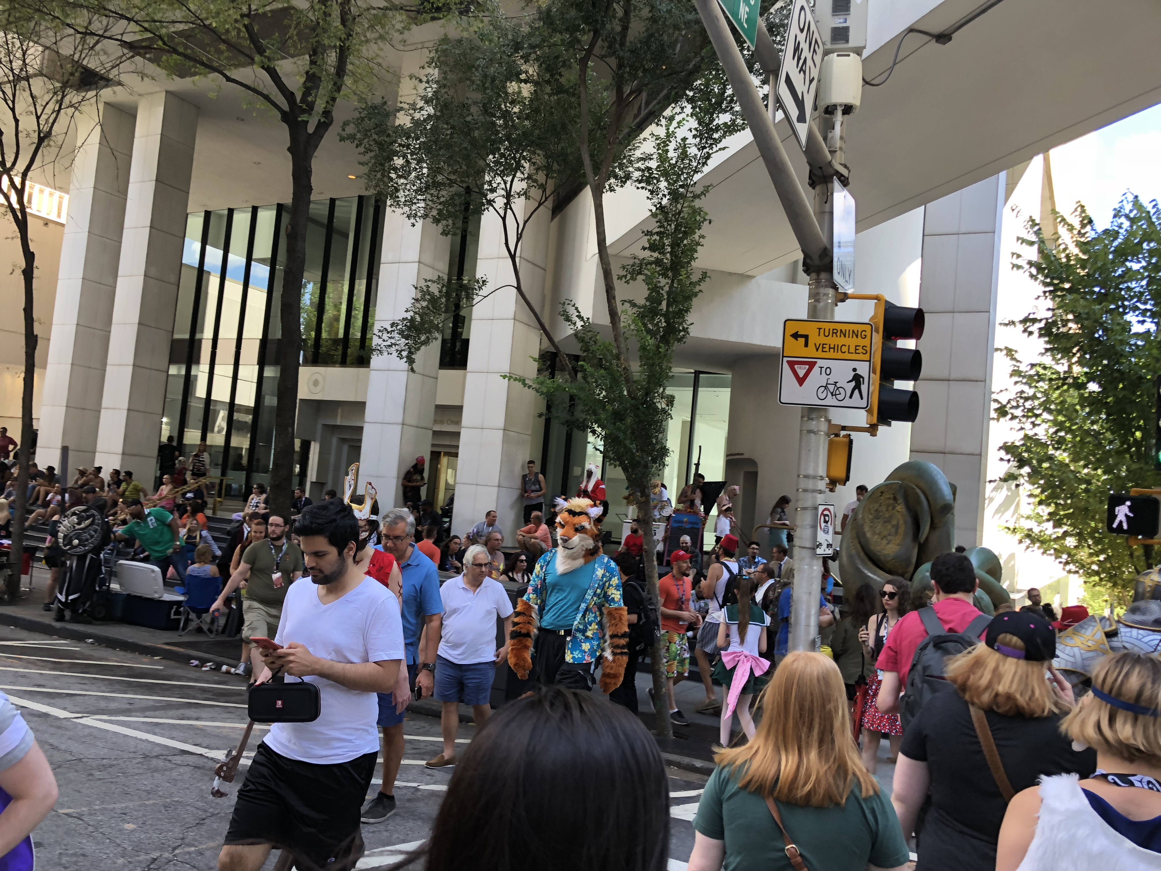 I was fine on Friday, so-so on Saturday, and on Sunday my social battery and energy level were both in the red and blinking. DragoCon is a crazy, big, loud affair (word has it there were over 90,000 attendees), and those kind of cons, while fun, tend to wear me down much faster than the smaller literary-minded ones. I will say that downtown Atlanta is a big party during DragonCon, and that the cosplay in particular was off-the-charts excellent.