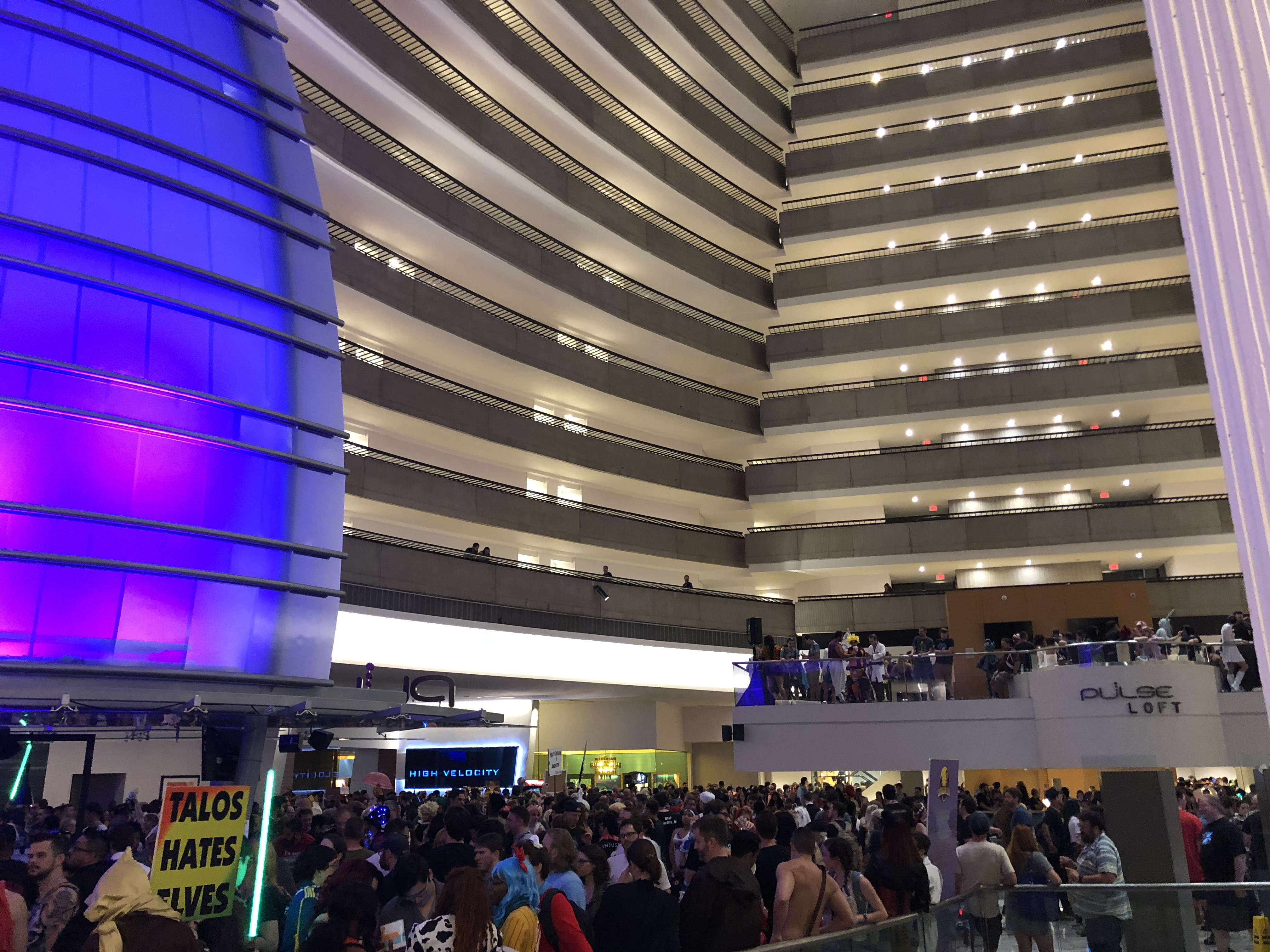 The lobby of one of the four DragonCon hotels, the Marriott, on Saturday night.