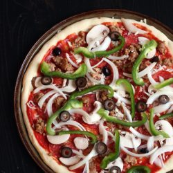 Make pizza night super duper out of this world with homemade pizza. This recipe is supreme with vegetables and two types of meat. Yum!