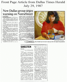 And, it all began when her husband, Mike, succumbed to Brain Cancer in 1985 and her research at one of the nation's top Medical Schools, which showed how Aspartamecaused Brain Tumors in the laboratory.