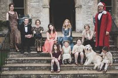 The dysfunctional Radlett family, with Uncle Matthew (Dominic West) as Father Christmas, Fanny (Emily Beecham) top step centre and Linda Radlett (Lily James) on her right