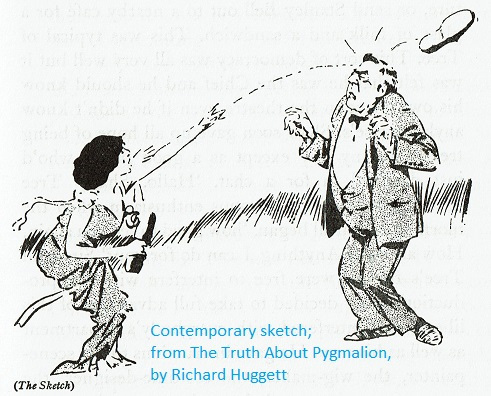 There is a marvellous book called The Truth about Pygmalion[4] about the first English production of Bernard Shaw’s play, which starred both Mrs Pat and Herbert Tree. Tree was a character actor who found it impossible to play straight roles. In rehearsals he gave Henry Higgins, on different occasions, a limp and a Scottish accent, on the grounds that every middle-aged bachelor drinks too much and has gout, and that most linguists are Scottish. It took all Shaw’s patience and self-control to get him to play without any accoutrements (and to stick to the script). Mrs Pat’s accent was so appalling it took Shaw considerable more ingenuity to teach her to speak cockney than it ever did Higgins to teach Eliza to speak posh. Then on the final week of rehearsals Mrs Pat disappeared completely and her place was taken by an understudy. She turned up out of the blue for the dress rehearsal as if nothing had happened. (She’d got married in the interim.) Meanwhile the moment the famously unromantic Shaw’s back was turned Tree added his own touch to the end of the play when he had Higgins throw a bouquet at Eliza.