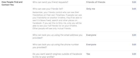 The last setting I just mentioned is fairly liberal but I’m an author and a social media strategist, and I want people to find me on the internet. If you want to be found on the internet because you’re an author or have a business, then you’ll want the search engines to be able to find you on Facebook as well. Ideally, you’ll want them to connect to your business page but connecting to your profile can have value as well.