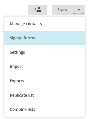 To work on the signup forms, go to your list and on the far right, click the arrow, and click on Signup Forms in the drop-down menu.