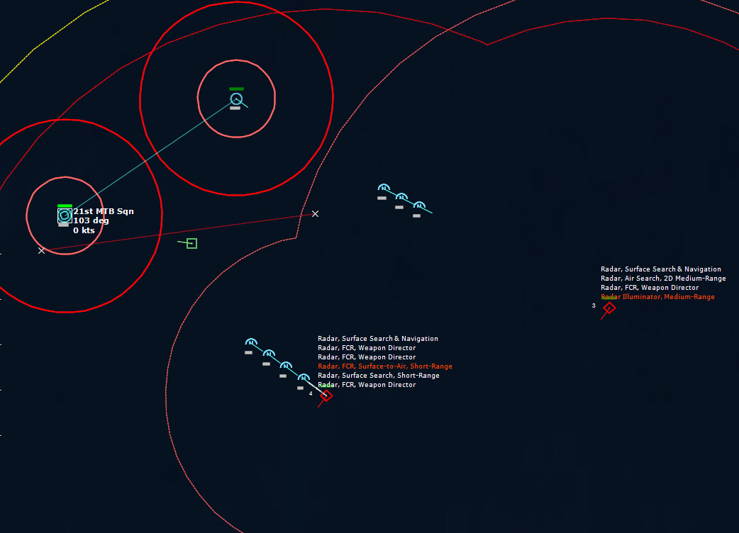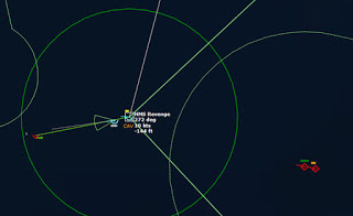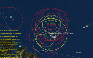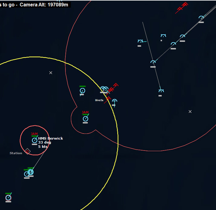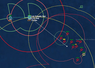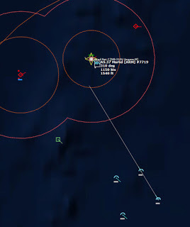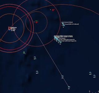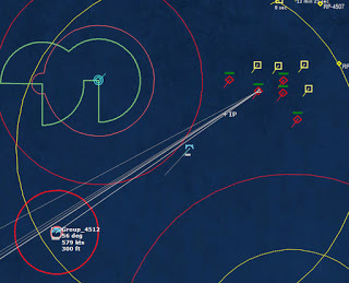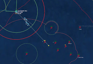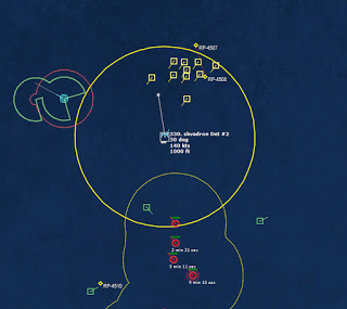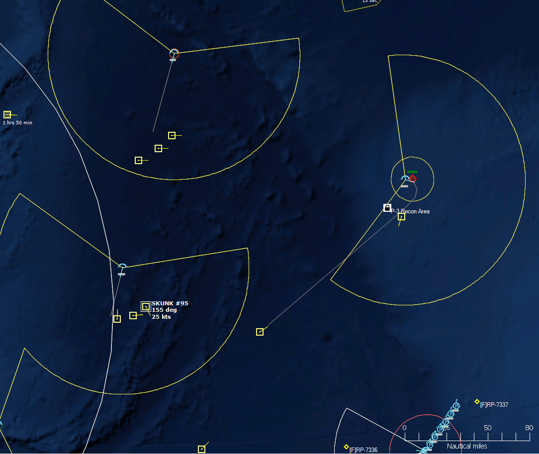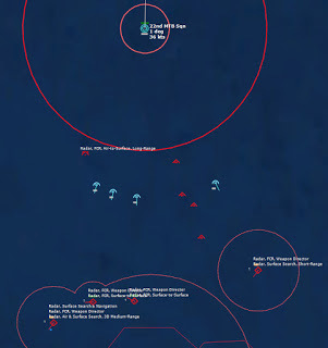 HMCS Algonquin 224346Z The Bogeys are getting too close for comfort, and are approaching the groups. Time to declare them hostile. The bad news is, both bogeys are flying at 36,000 ft, which is above the range of the Algonquin’s Sea Sparrows. Bogey 28 flies by the Lubeck and continues on, while Bogey 27 flies over the USS Mispillion, then the Lubeck, and continues to circle the group.