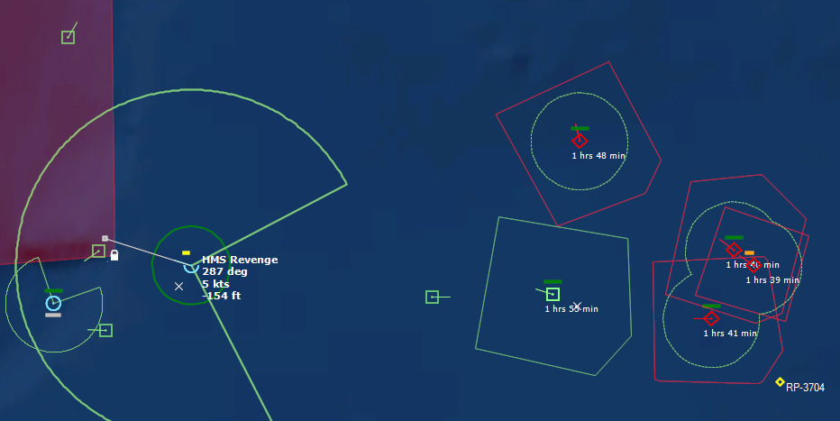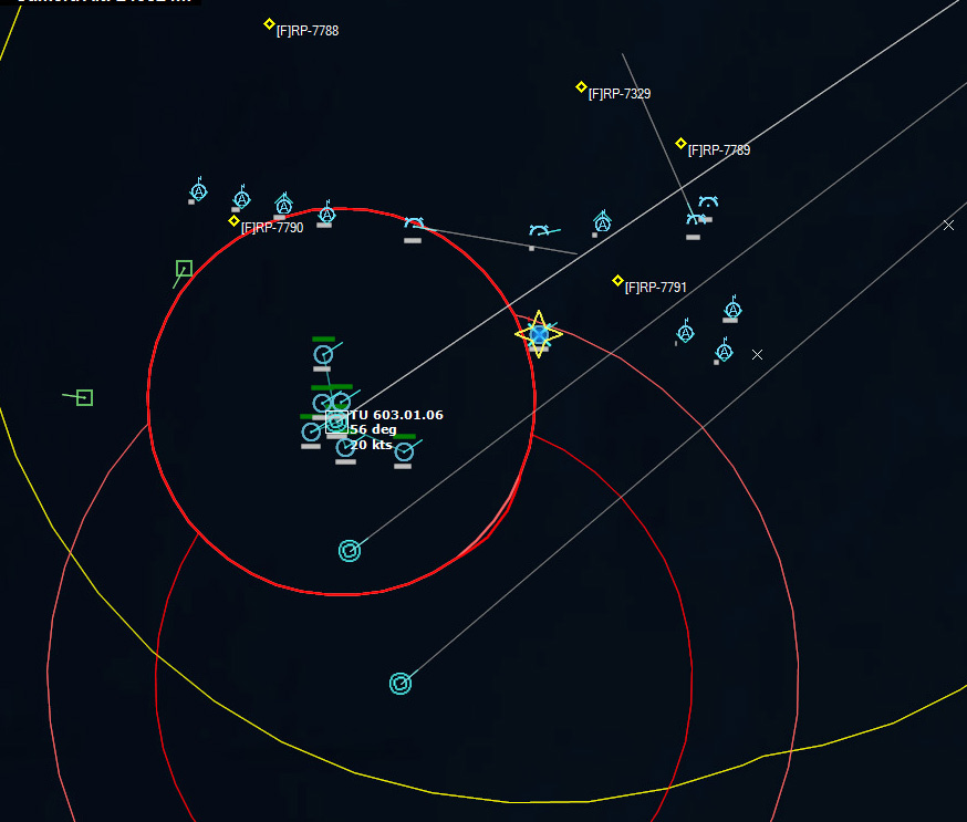 221401Z Most of the detected Soviet submarines do not have missiles, and so can safely be attacked by surface assets, but two, the Charlie and the Juliett, are missile capable, and therefore it would be prudent to tackle them with airborne assets. Unfortunately, the Charlie is very close to TU 603.01.04. Bacchante Flt 1 still has a Mk11 Depth Charge, however, and is moving to engage the Charlie.