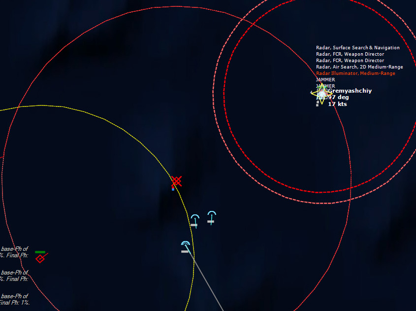 211004Z Four Buccaneers fly in to finish off Ognevoy, dodge the three fired SA-N-1b Goas, and launch 11 AJ.168 Martels at the hapless vessel. The first missile sinks it, while the remaining ten missiles are all overkill.