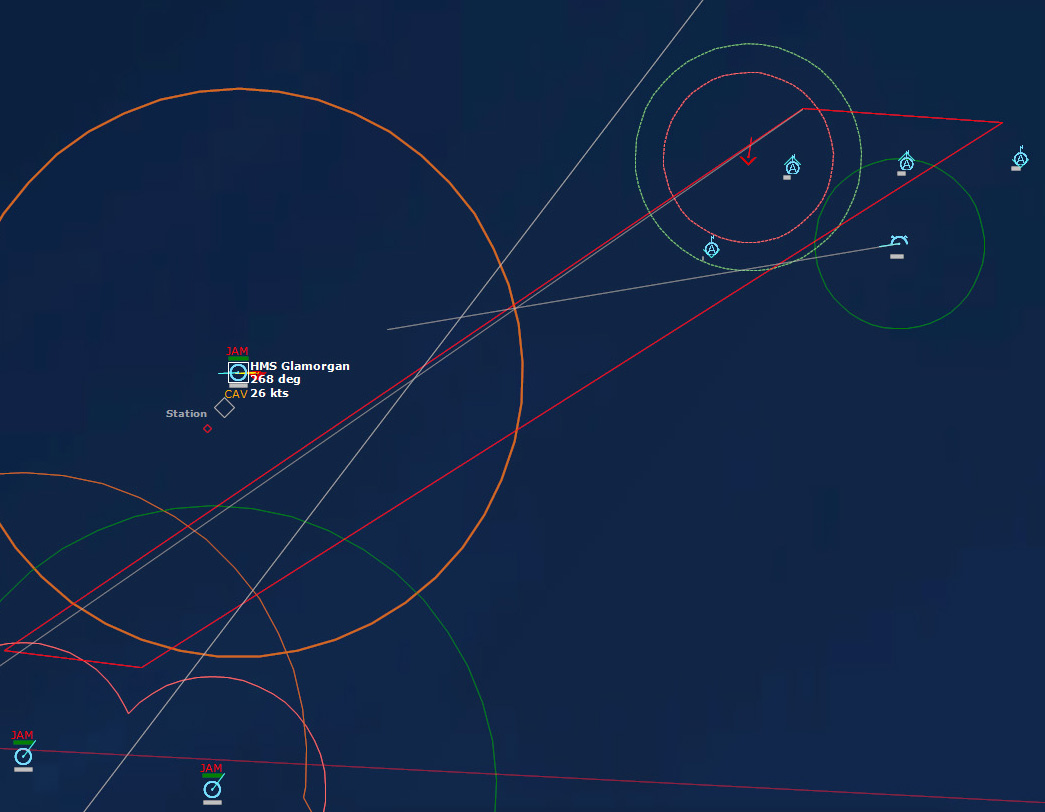 The searching helicopters find nothing023806Z A submarine is located, and the helos swarm it like angry bees.024020Z Glamorgan Flt 1, a Wessex HAS.3, arrives on the scene first and drops a torpedo. The torpedo searches...and strikes the target, hitting B-64. The contact disappears.