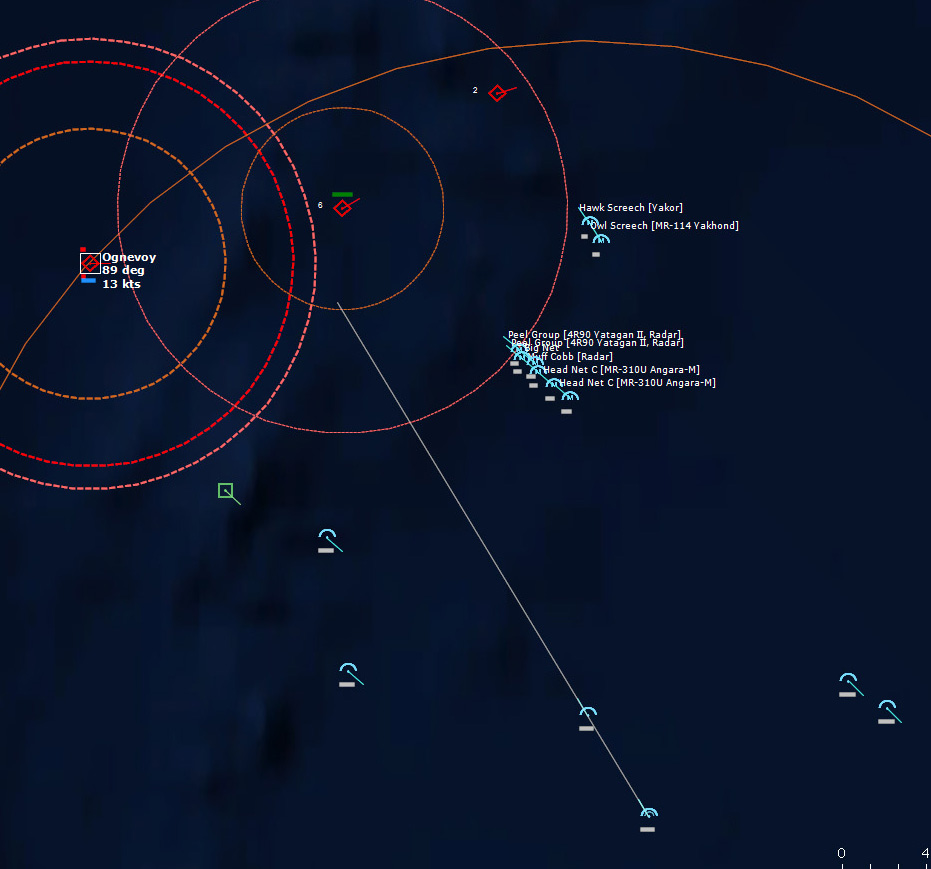 230600Z Assuming that the bogey that had earlier buzzed the Lubeck was still enroute, USS MacDonough waits in ambush, and then switches its radars on. Contact! The target is declared hostile.230620Z MacDonough launches a RIM-67A SM-1ER at the bogey. The first missile misses, but the second brings down the target, identified as a Bear-D.