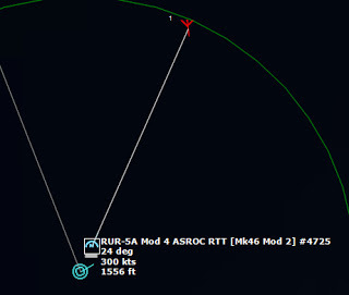USS MacDonough 223155Z USS MacDonough gets into range of a Zulu IV contact, and launches a RUR-5a Mod 4 ASROC RTT [Mk46 Mod 2] at the contact, near maximum range. The torpedo damages the submarine, but does not destroy it, so the MacDonough fires a second ASROC. The Charlie responds by diving deep and fleeing, and the second ASROC misses. The MacDonough, which had previously changed course to evade any retaliation, now turns back to continue prosecuting the target.