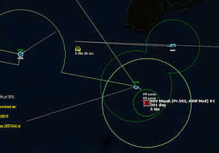 ASROC launch 223847Z The third ASROC Mk 46 hits the target, sinking it.223951Z HMCS Algonquin and FGS Lubeck detect a pair of bogeys bracketing the group to the east and west. The bogeys appear to close in. So far the contacts are detected by passive sensors only. The Algonquin waits in ambush for the bogey to get in range before turning sensors on.