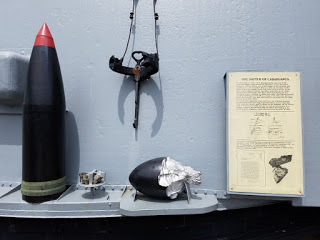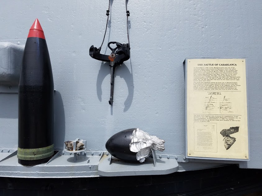 A display showing a 16" shell, and fragments from 16" hits against the French Battleship Jean Bart during the Battle of Casablanca.