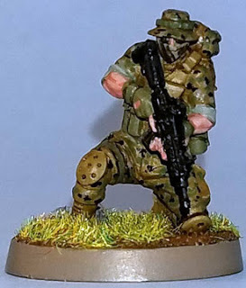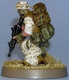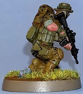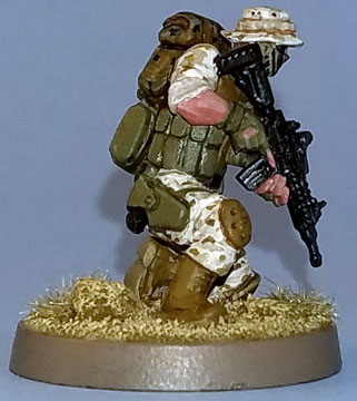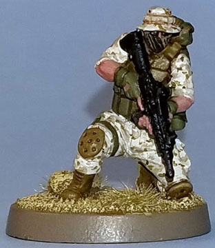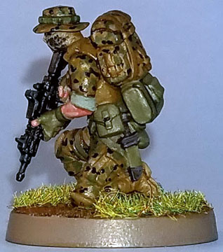 The boots, kneepads, vest I used 921 English Uniform.The skin was painted GW Tanned Flesh highlighted with GW Tallarn Flesh.