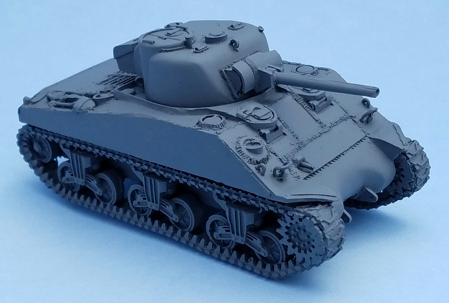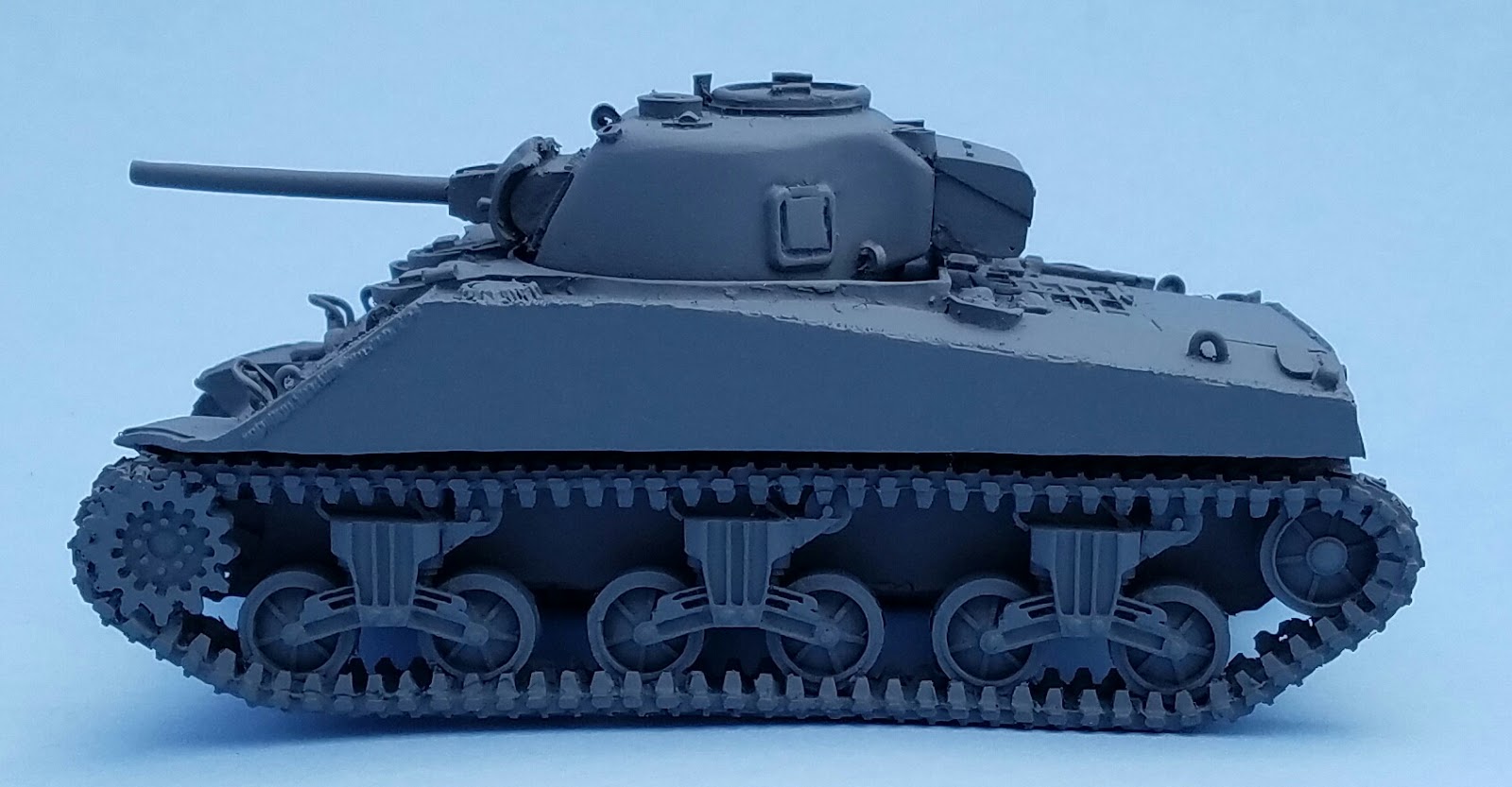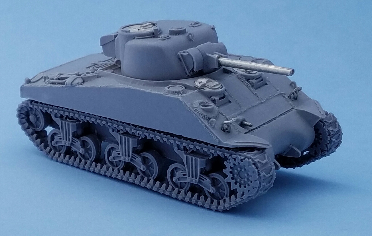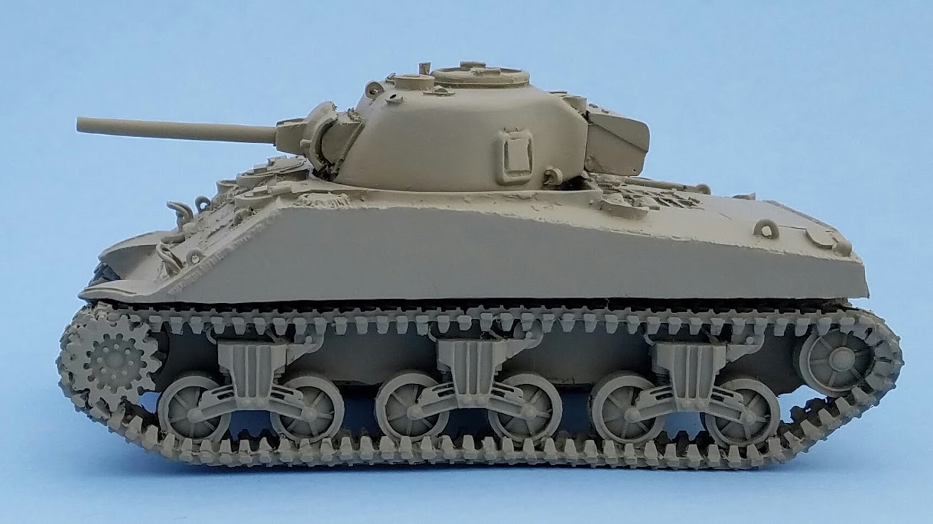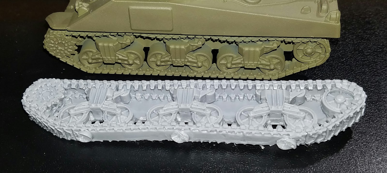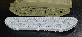 One of the first things I noticed was that as I was trimming the flashing off of the pieces I noticed that the tracks seemed to be a bit too long, at least compared to the M4 Shermans I have. Shermans come in many varieties, but one, the M4A4, had a lengthened hull compared to the others due to its Chrysler A57 multibank engine.