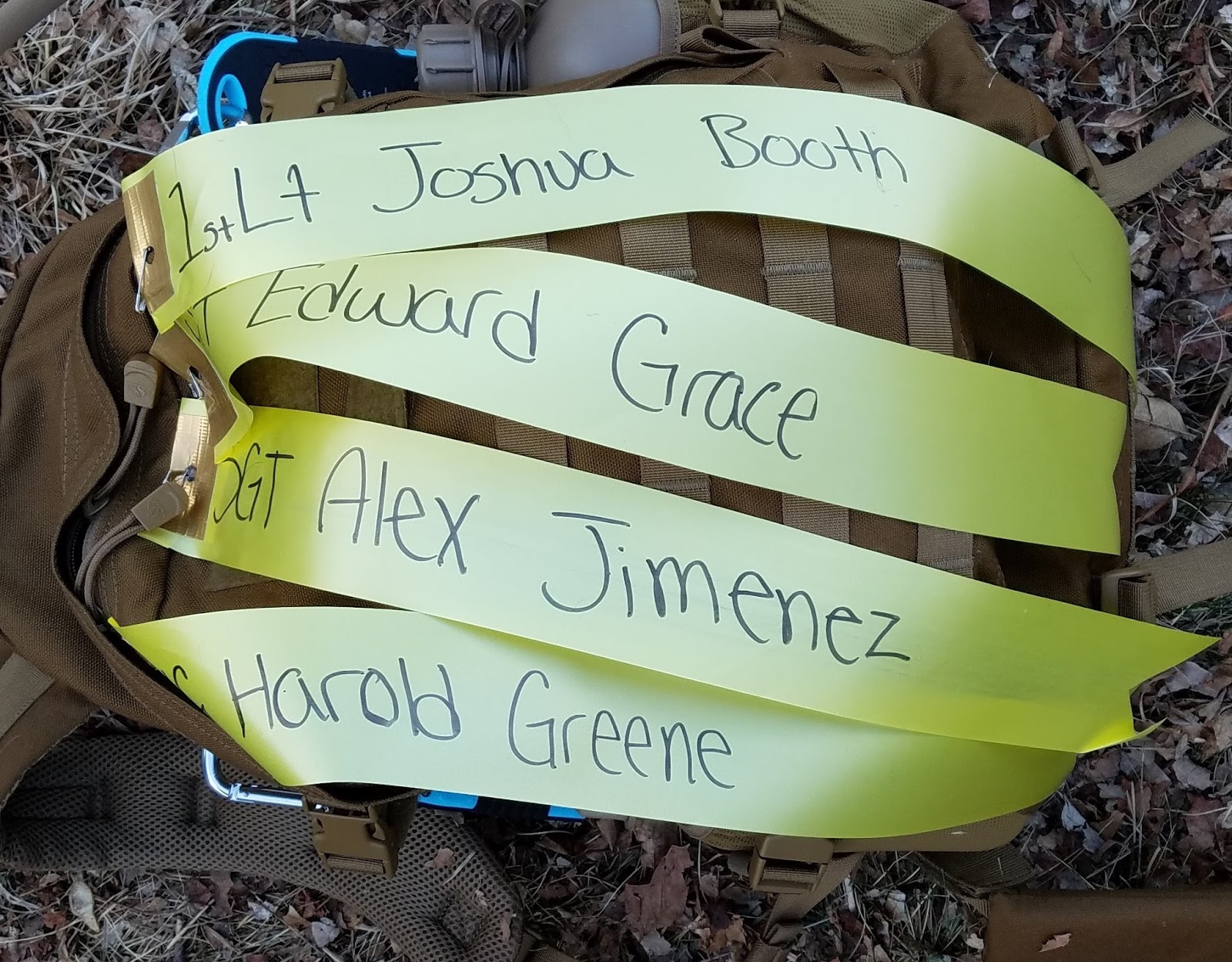 SSgt. Alex JimenezMaj. Gen. Harold GreeneAnd one more: very early in the ruck, someone's ribbon was ripped off their ruck and blown away by the wind. I chased it down and grabbed it. I wasn't sure which rucker had been carrying it, so I carried it the rest of the way myself to ensure it got across the finish line.