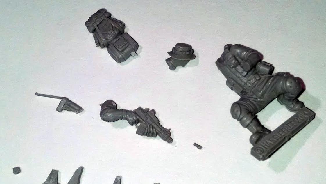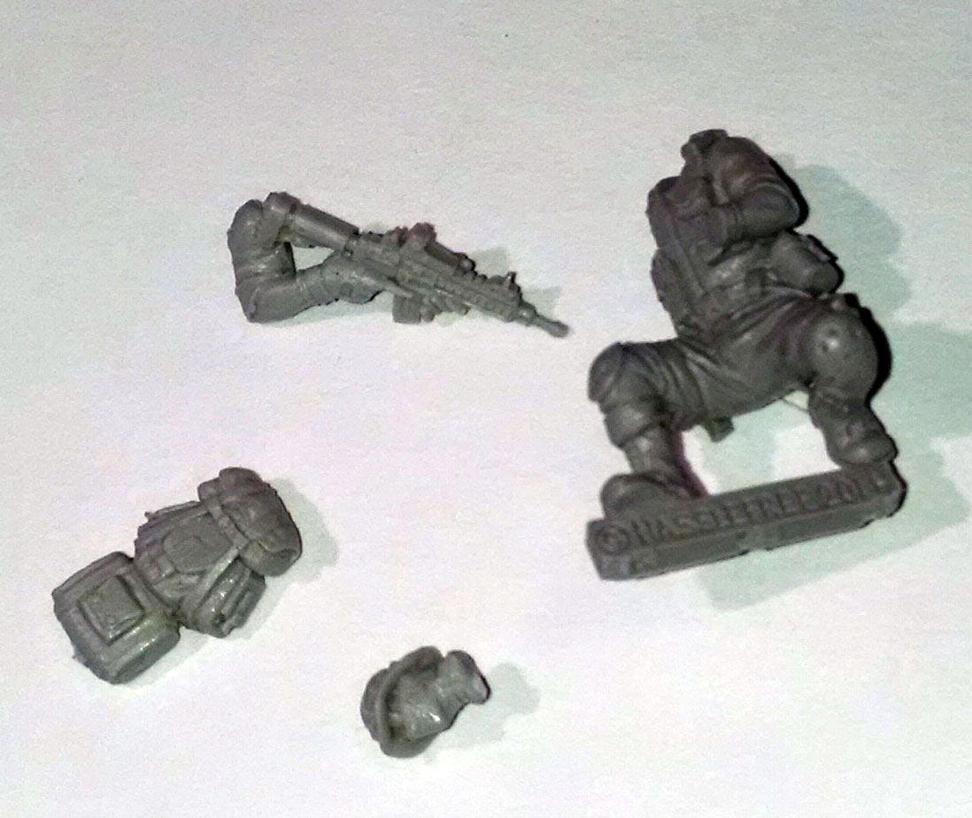 Apparently due to the popularity of my Woodland and Desert MARPAT tutorials, recently I was contacted to do a commission. The task was to paint two identical 28mm miniatures, one in Woodland MARPAT, one in Desert MARPAT.I received the miniatures in the mail, and I expected them to be metal, as it certain looks metal in the image to the left. I was surprised to find out that they were resin instead! This is not normally a problem, but resin miniatures are more fragile, and unfortunately one of the miniatures was damaged in the mail. The butt of his pistol snapped off, as did the stock and barrel of his rifle.