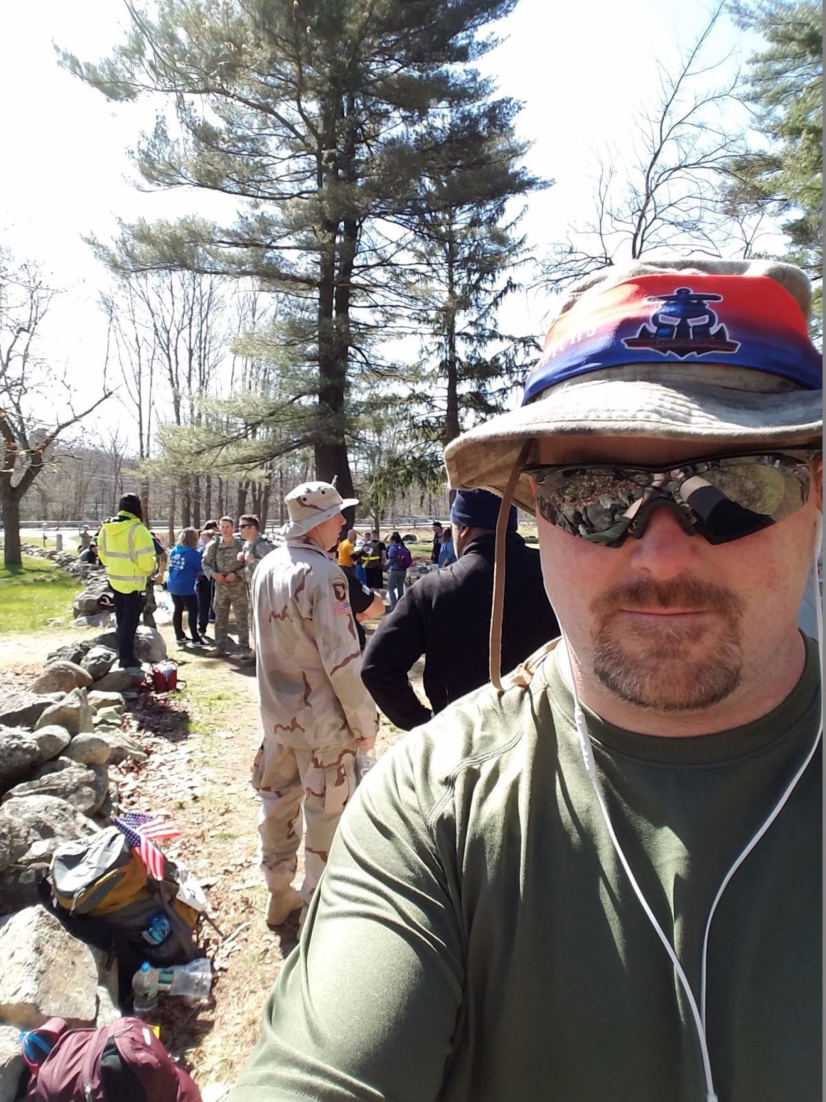 The four ribbons I carried on my ruckThe ruck was to start around 7:00am, and I was worried about time, as they were supposed to close the course at 4:15pm. I needed every minute because I am glacially slow, but if I could manage a 3 mph pace the entire way I would be ok. At about 7:10, we were called to the starting line. There we heard the national anthem, heard a few words from some speakers including a survivor from the Boston Marathon bombing, and then observed a moment of silence.