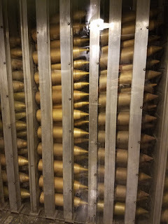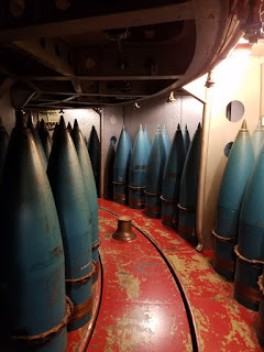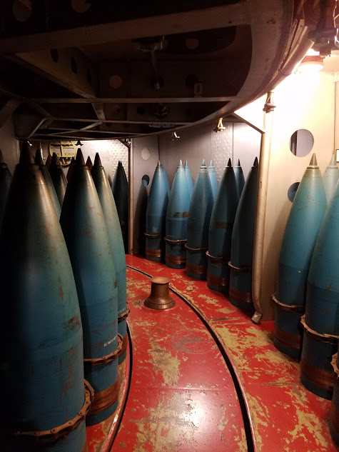 16" shells, stored within the barbettesTurret #2, being the highest above the deck, has an additional level, called the balcony, and there more 16" shells are stored. During the Battle of Casablanca, the ship nearly ran out of 16" shells (which is pretty amazing to contemplate), and extra shells has to be transported from Turret #2 to Turrets #1 and #3. Fortunately the ship was designed with a rail system to do this, for just this situation. Transporting the shells through the passageways wouldn't exactly be easy, if it were even possible.