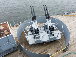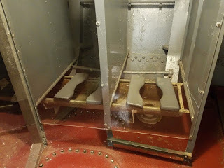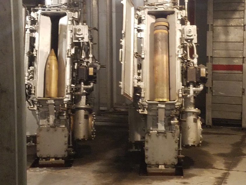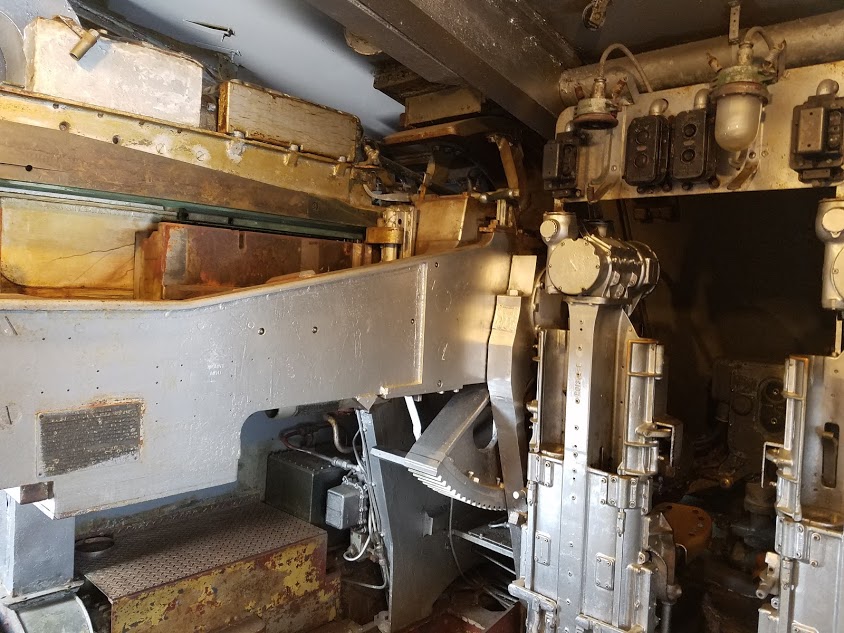Inside the 5"/38 turretThe 5" gun turrets are very cramped inside, and must have been very crowded during battle. There is a seat to the far left where a crewman sighted the guns, and a pair of seats--they look like bicycle seats, really, between the two guns. When manned, it's so tight that the two men must have been in physical contact with each other. And then there are the loaders who were moving around in tight quarters as well.