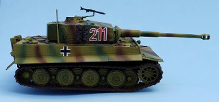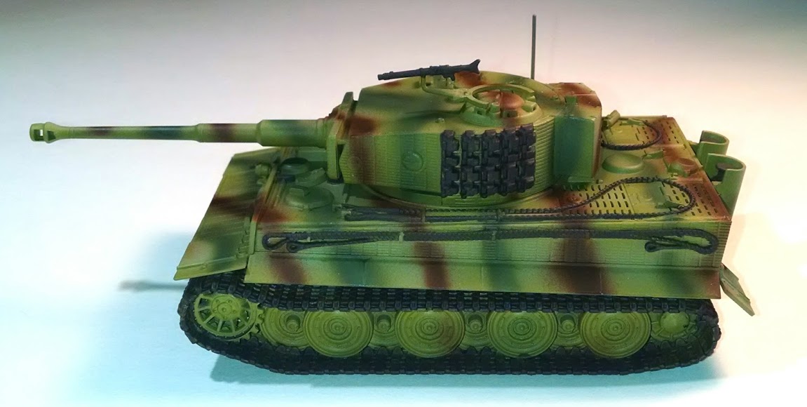 And above with the Hull Red added. The Hull Red certainly did tone down the Buff, and the tracks are beginning to look more like worn metal rather than monochrome painted plastic.I apologize for the different tints in the photos, as they were taken in different lighting conditions--the ones with the bluish backgrounds were taken in natural lighting conditions, while the more yellow-tinted pictures with whitish background were taken under indoor lights. In all the pictures the Tiger was placed on a sky-blue piece of posterboard for a background.