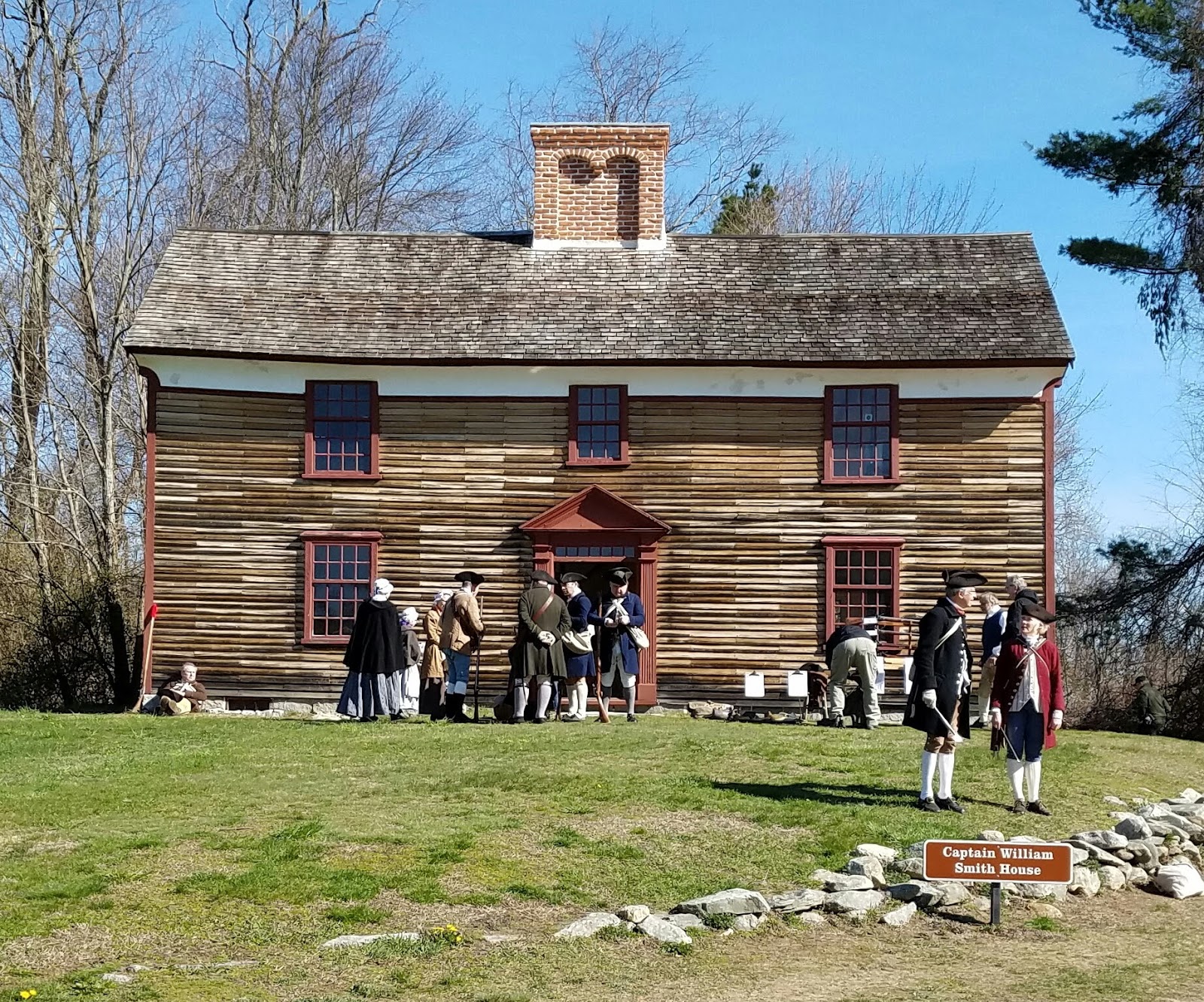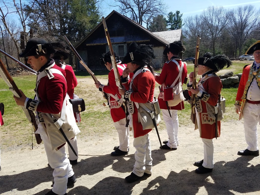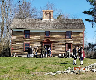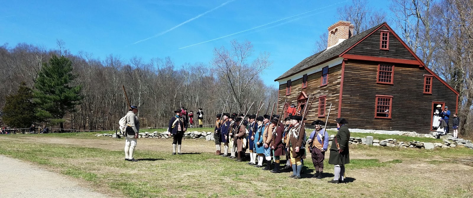 Colonial Militia reenactors drill outside of the Captain William Smith HouseMy feet were starting to get some hot spots, so I resolved to change my socks and take care of them when I got back to Meriam House, which would mark the halfway point of the marathon.