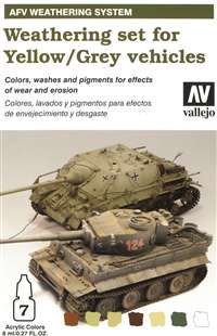 The set contains several paints, including Black Brown (for tracks & paint chips), Buff (sand/dust), Hull Red (rust), a wash for yellow vehicles, a wash for grey vehicles, a mud-colored Pigment, and Pigment Binder.