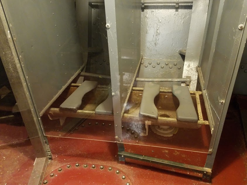 Luxury accommodations, to be sureMy father served on a Sumner-class destroyer in the late 1950s, and told me that the toilets were essentially a trough with water flowing along it, and seats on top. He wasn't kidding. The battleship's facilities were much the same.