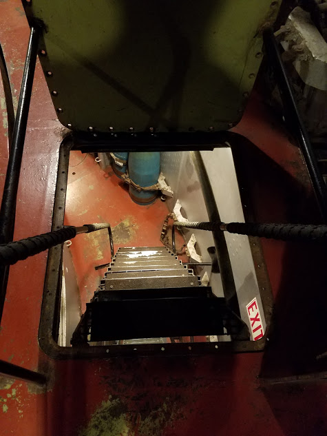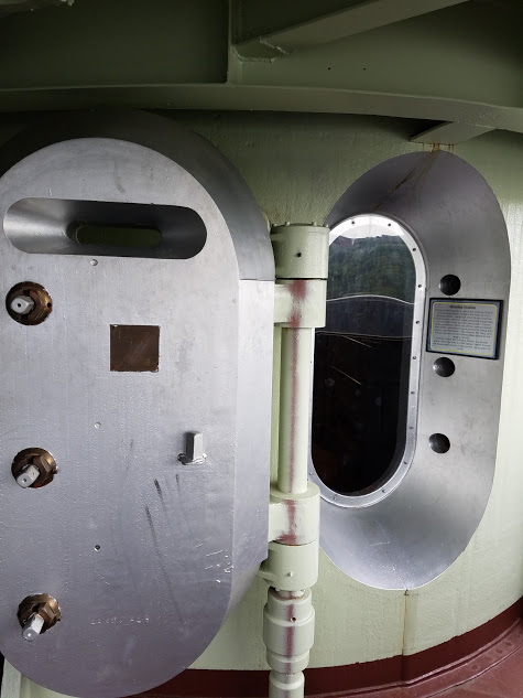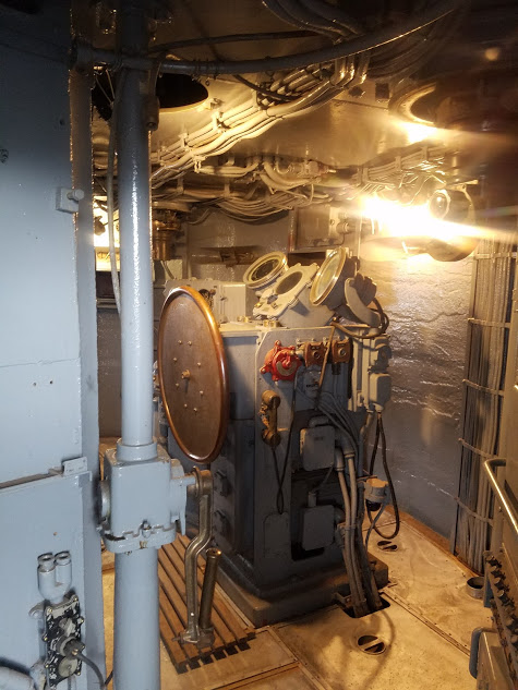 Hatchway (with 16" thick armor) to the Conning Station, where the ship was actually steered during combatThe bridge itself was empty except for a few chairs--it really was a pilothouse rather than the "bridge." The "real" bridge was the Conning Station--just aft of the bridge, and protected by no less than 16" of armor. Inside the room was the ship's wheel, some scopes, and the engine enunciator. In this well-protected compartment is where the ship would be controlled.