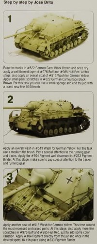 I used small sponge to dab on the paint chips, mostly near the edges of the plates, but with some over flatter sections as well for some variation. At this point I began to feel that the model was starting to come together.Step 2 Apply an overall wash in #513 Wash for German Yellow. For this task use a medium flat brush. Pay a [sic] special attention to the running gear and tracks.