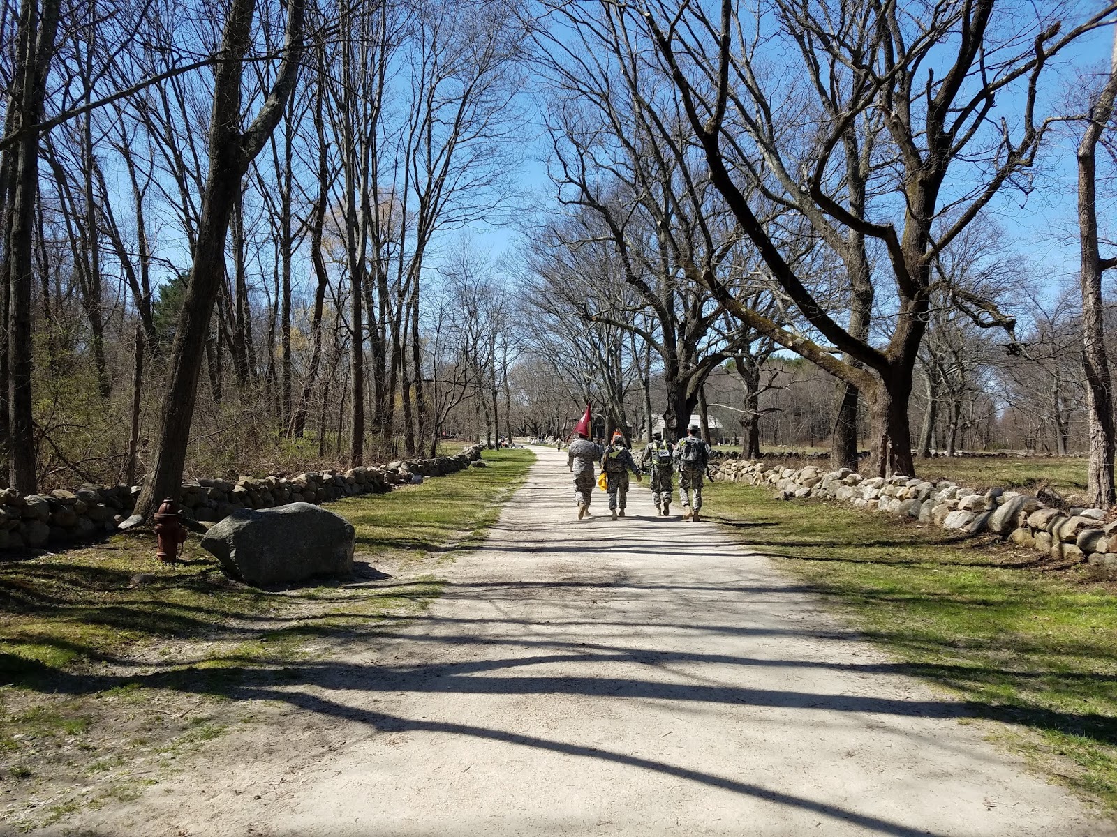 On the way to Meriam's CornerWe passed Meriam's Corner and headed north on Old Bedford road to do a loop to add some distance, and then returned to the beginning of Battle Road. We would have to travel the length of Battle Road four times during the ruck. Meriam House was also the location of the first hydration station. We had gone 4.5 miles in 1:20, and already people were sitting down to rest. It was warming up, so I shed my outer layers and got some food out of my ruck. I stopped for four minutes to do this, worrying about the lost time, and even that short time with my ruck off my shoulders was a relief, as my right shoulder was already aching. The short rest helped, and I was quickly on my way again.