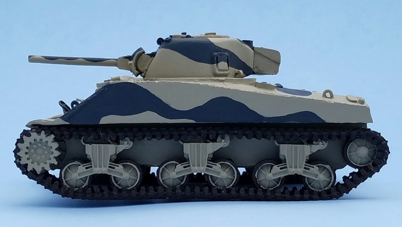 I liked the idea of painting it in the camouflage Light Mud and Dark Grey instead of the usual Allied Olive Drab colors.One of the first things I noticed was that as I was trimming the flashing off of the pieces I noticed that the tracks seemed to be a bit too long, at least compared to the M4 Shermans I have. Shermans come in many varieties, but one, the M4A4, had a lengthened hull compared to the others due to its Chrysler A57 multibank engine.