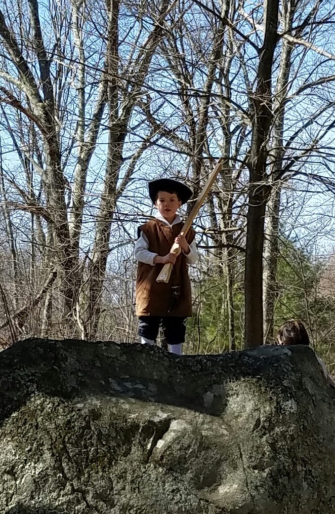 A Minuteboy keeps an eye out for Redcoats from atop a large rockIt was getting closer to noon, and more reenactors were showing up in preparation for the reenactments of the Battle of Lexington and Concord.