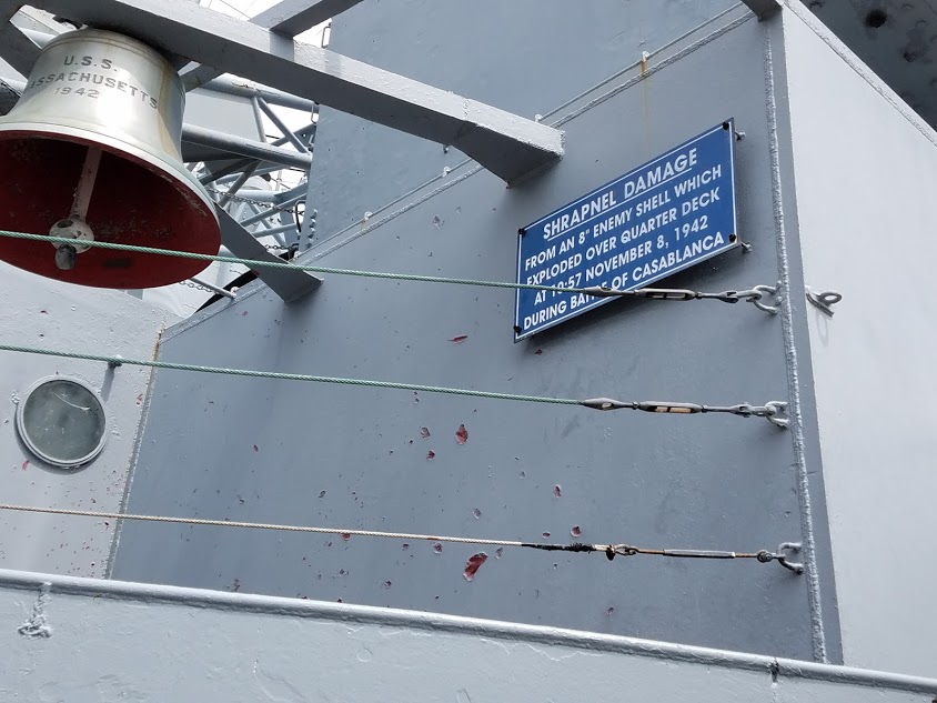 Shrapnel damage from an 8" shell that exploded over the deck during the Battle of Casablanca. The shrapnel damage reminds you that the deck is not a place you want to be during an action. It makes me wonder about those who worked the AA guns, who despite all the metal around them, must have felt very exposed. If shrapnel can tear chunks out of the steel of the ship's superstructure, one can only imagine which it would do to a person.