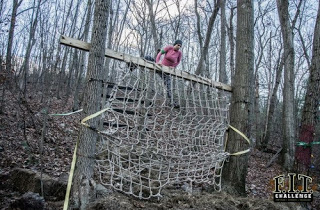 Eventually we got started and up Diamond Hill we went. Diamond Hill is roughly a 400 ft. hill that gets very rocky near the top. Lots of the rock is loose, so you have to watch your step. I followed the crowd uphill, and for the first mile or so, it seemed that we were following the same course as we did in November. I managed the hill ok, but my heart rate was really spiking--a testament to my lack of conditioning. The first few obstacles were simple climbing obstacles like ladders and cargo nets.