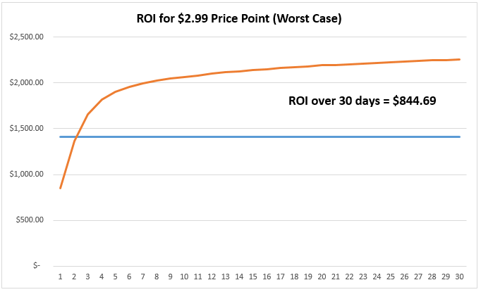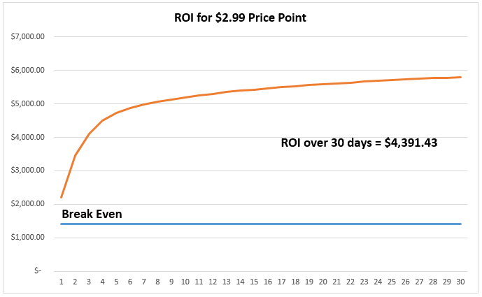 ...Wow. For the $2.99 price point, the Break Even is reached on the first day, with total royalties equaling $5,804.43. This leads to an ROI of $4,391.43.