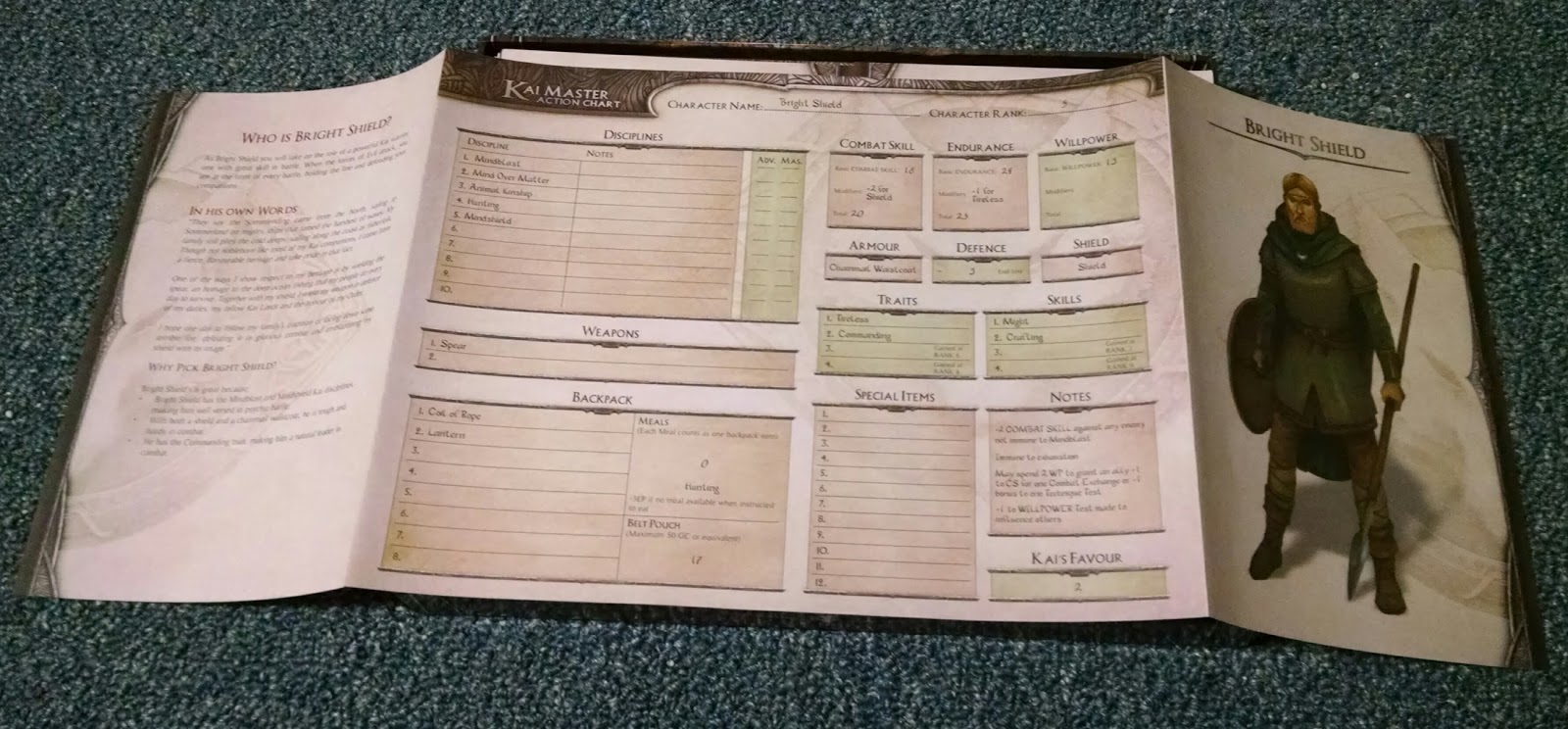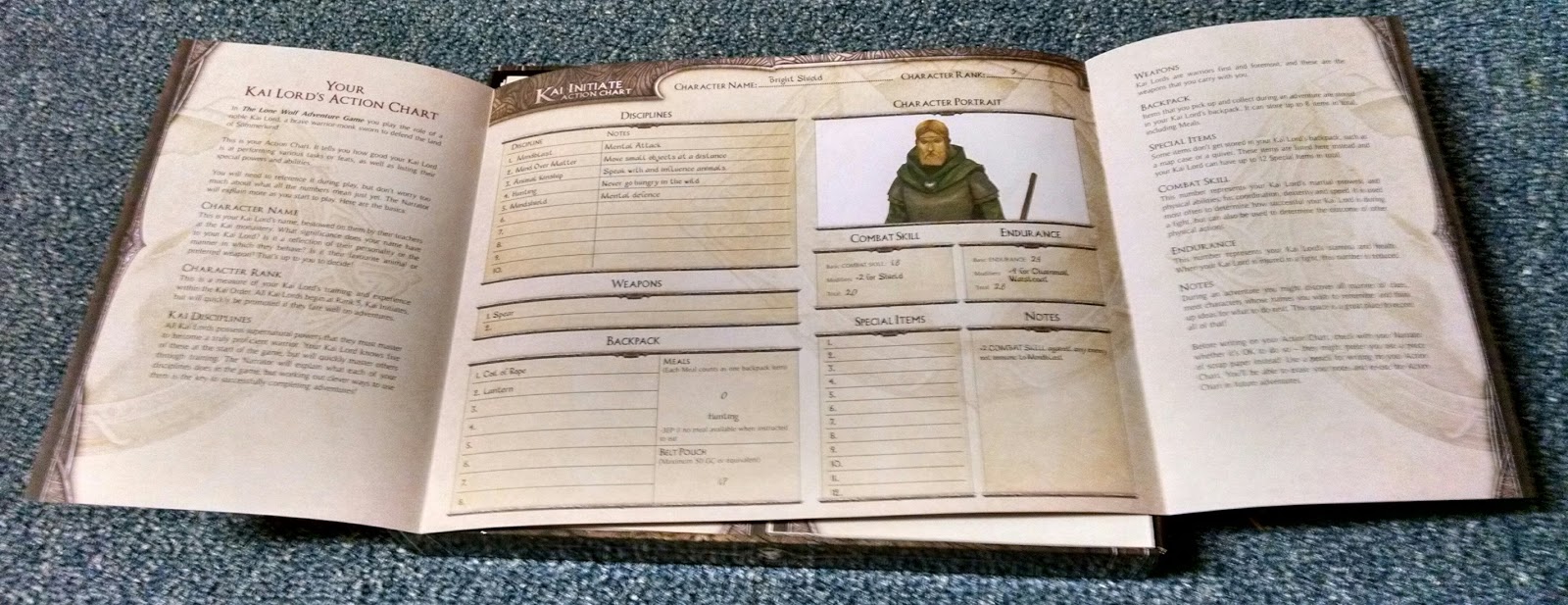 Inside is a quick start "read me first" handout, along with several "Action Charts" (the Lone Wolf equivalent of "Character Sheet") for six pre-generated characters that come with the game. Four are male, and two are female.