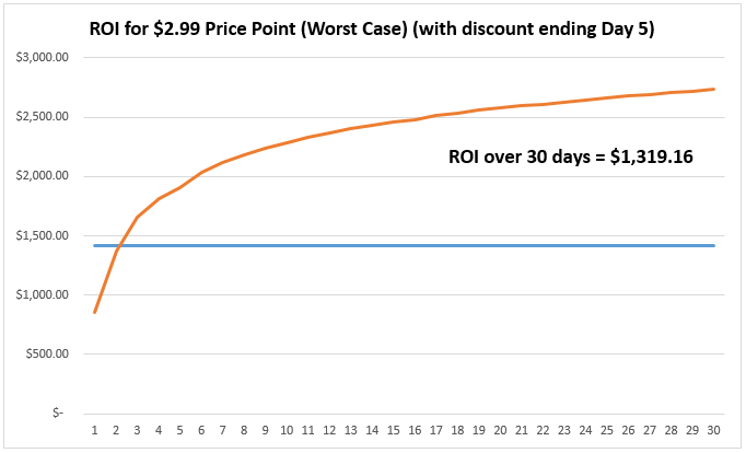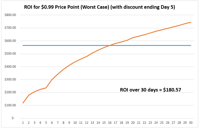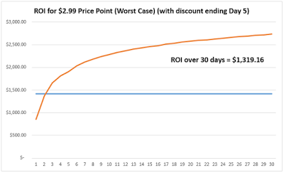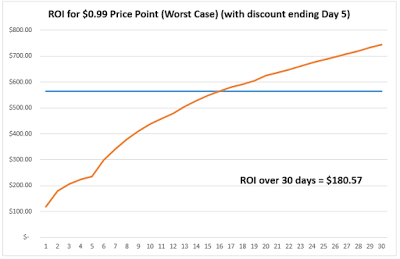 Here, the visible "bump" in royalties caused by the end of the discount isn't as dramatic, but there still is a benefit. The ROI over 30 days still goes up by 56%.So that's the bottom line. No matter what you price your book at, even if it underperforms, it's likely that you'll make your money back with room to spare. What's more, these numbers don't account for any "spillover" sales you might get for your other titles. (as an aside, make sure you have other titles available to benefit from this)