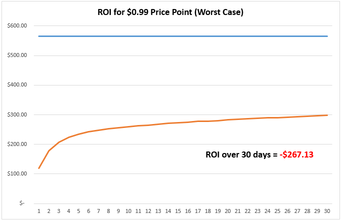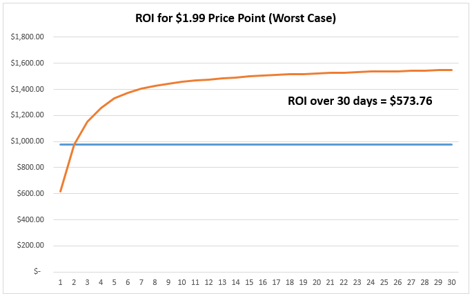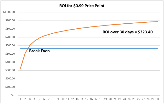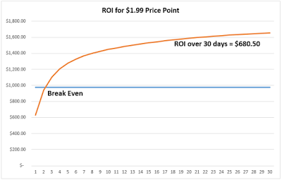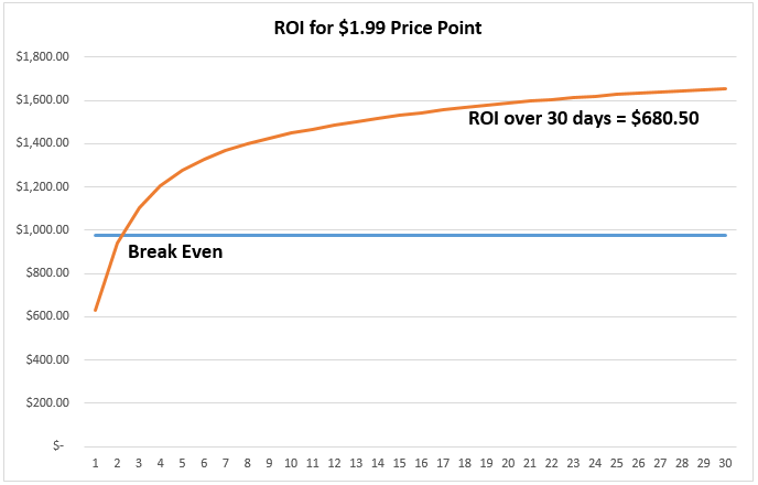 The $1.99 price point gives even better results. The Break Even point is Day 3 again, and Total Sales is $1,655.50, yielding an ROI of $680.50.