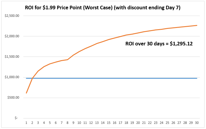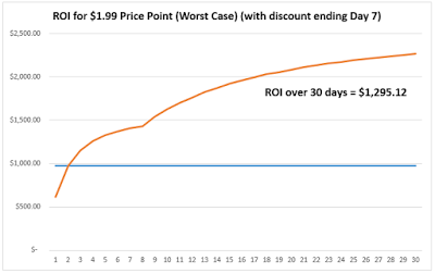 Now things don't look quite so bad. Reverting back to the original price causes a large bump in royalties, which is enough to produce a respectable ROI.For the $1.99 price point Worst Case: