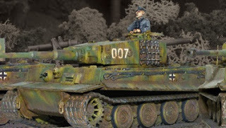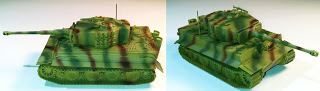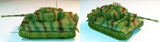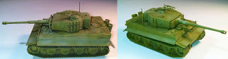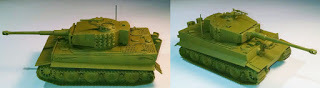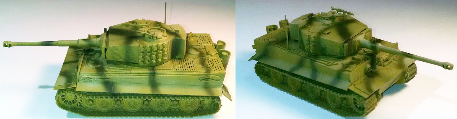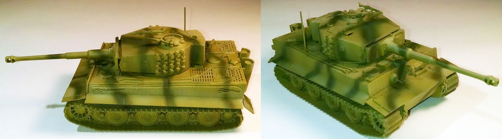 Step 3: Now to start the camouflage. Airbrush stripes with #092 Olivgrun. This requires some control, and it's the first place where I can "really" screw up. Since this kind of airbrushing is all about gentle transitions between colors, if I mess up severely, I need to start over. Completely over. Still, I did a decent job here, although I did get something of a heavy spray onto the top of the turret--you can see how the camouflage stripe is thicker and darker than the other stripes. But it's not too bad. For a perfectionist like me, it's hard to overlook it, but I need to move on.