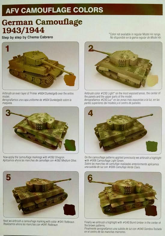 To my vast relief, they did. With 2-3 drops each of Flow Improver and Thinner to ten drops of paint, I got a very good mix of paint that actually gave a decent spray of paint without clogging. I still need practice with flow control on the airbrush and technique, but at least now I was in business.So after that very long introduction, I could finally work on the Tiger tank. Conveniently, the Vallejo German Camouflage 1943/1944 set comes with illustrated instructions on the back of the box: