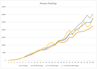 Once I had tracked the rankings of each title, I grouped them by promo price point and averaged the rankings. I then plotted the results for the 30 day period for each average: $0.99, $1.99, and $2.99-$3.99, and Overall Average.