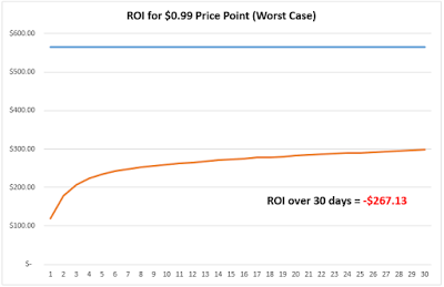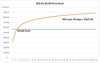 Looks like a sound investment. The Break Even point is reached on Day 3. Total Royalties over 30 days is $888.40, resulting in an ROI of $323.40. Not bad.