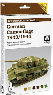 In frustration I ordered some airbrush specific paints (up to this point I used mainly standard model paints). Since my first project was to be a Tiger tank for Bolt Action, I ordered the Vallejo AFV Camouflage set for German Camouflage 1943/1944.