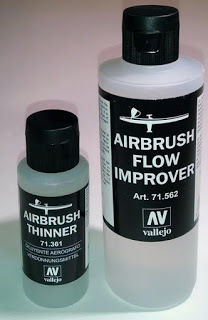 I did some searching on youtube for airbrush tutorials to get tips on thinning, but without much success. I finally decided to buy some Vallejo Airbrush Thinner and Flow Improver, in the hopes that these would save the day.
