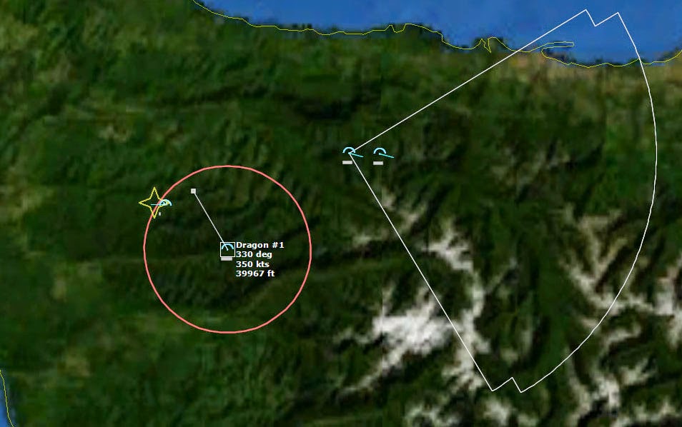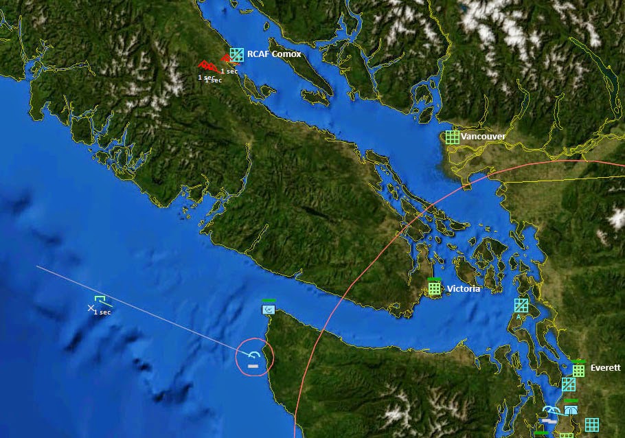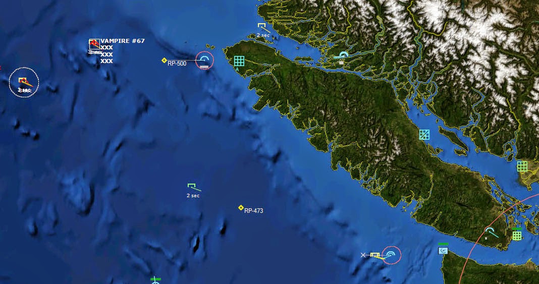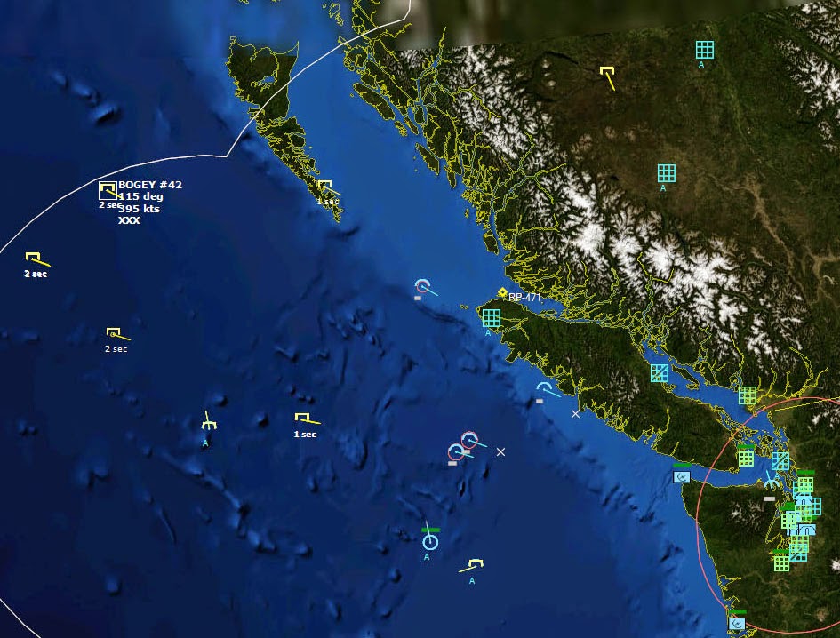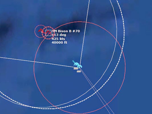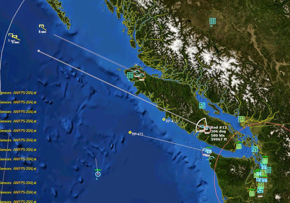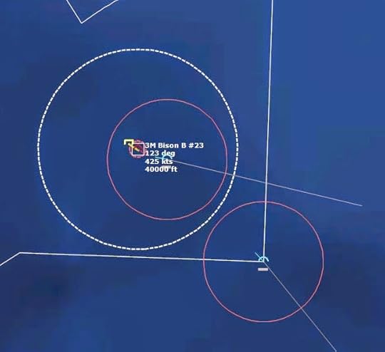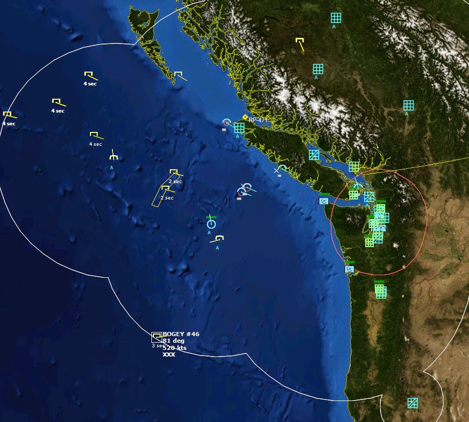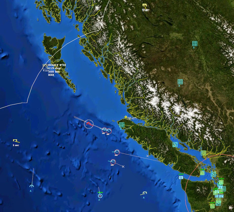 King Flight engages the Bears.223436Z I watch on the screen as the three guided weapons--still unidentified--streak past RCAF Comox at 920kts at 59,000ft. I cringe as two more are launched by the Tu-95KD Bear Bs that Nighthawk 1 failed to stop. The three passing RCAF Comox appear to be heading towards Vancouver, and there’s nothing available to stop them.