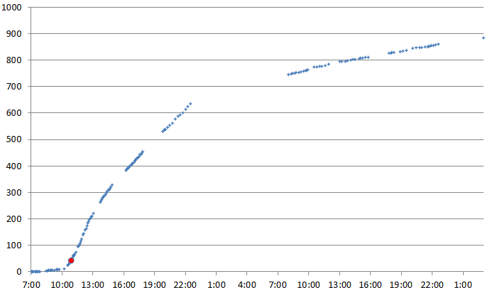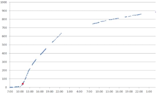 The graph below shows my total number of downloads throughout the two day promotion, starting at 7am on Day One, and ending at the end of the promotion. The BookGorilla email went out about 10am, and the red dot on the graph shows when I received it. Clearly it did have a significant impact.