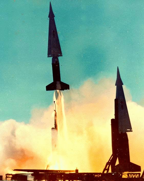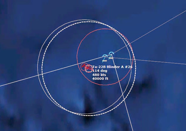 The Soviet nuclear bomber goes feet dry over American soil. 222657Z As the Blinder approaches within the The Nike Hercules SAM site S-92 launches a pair of MIM-14B Nike Hercules nuclear SAMs against the Blinder Tu-22B #37 at max range.222828Z I order Dragon 1 cut its afterburner and loiter to see if the SAMs will take out the Tu-22B. If they fail, Dragon 1 will move into to finish the job.